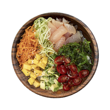 (Poisson blanc, concombre, carotte, mangue, avocat, tomate cerise, wakame spécial)