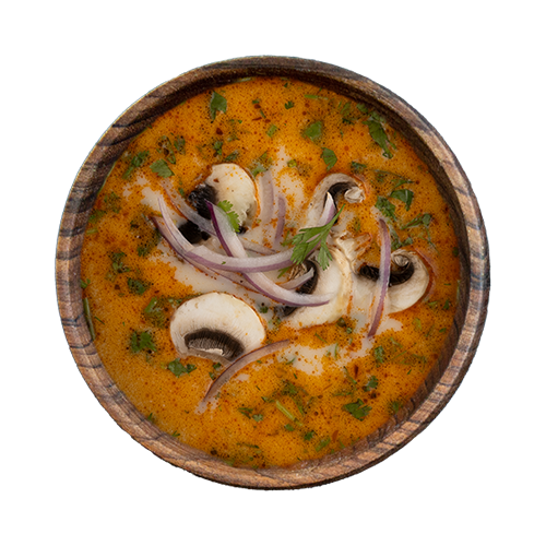 Tomate cerise, galanga, piment, feuilles kaffir, champignon, lait de coco, citronnelle, oignon, coriandre